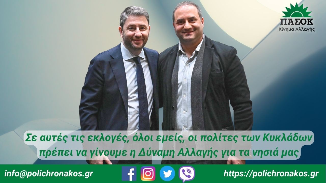 Ο υπ. Βουλευτής του ΠΑΣΟΚ στο Νομό Κυκλάδων και αν. Τομεάρχης Νησιωτικής Πολιτικής κ. Γιάννης Πολυχρονάκος, έκανε την ακόλουθη δήλωση αναφερόμενος στην προκήρυξη των εκλογών για τις 21 Μαΐου: