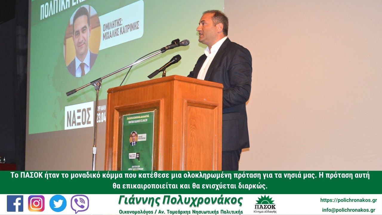 Δυνατό μήνυμα λίγο πριν από την εκλογική αναμέτρηση της 21ης Μαΐου έστειλε η Νάξος κατά την ανοιχτή συζήτηση που πραγματοποιήθηκε στη Χώρα και το κάλεσμα που απηύθυνε για τις εκλογές ο υπ. Βουλευτής Κυκλάδων και αν. Τομεάρχης Νησιωτικής Πολιτικής ΠΑΣΟΚ κ. Γιάννης Πολυχρονάκος.