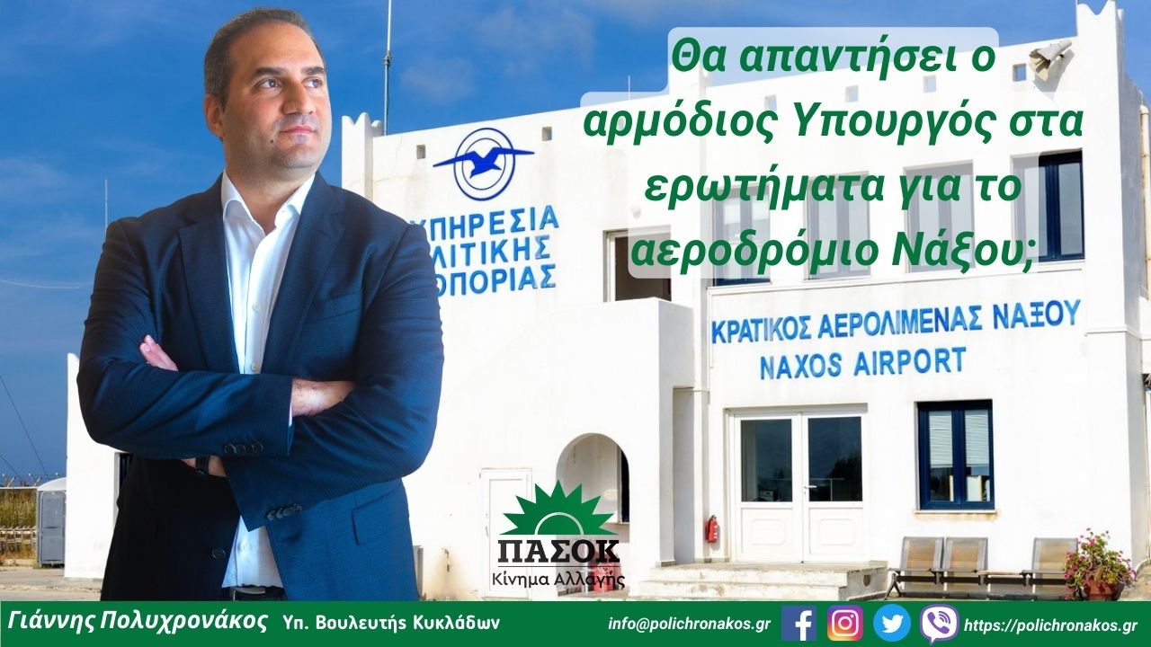 Στα ζητήματα που σχετίζονται με την ασφάλεια του αεροδρομίου Νάξου αλλά και στην αναβάθμισή του, αναφέρεται ο υπ. Βουλευτής και αν. Τομεάρχης Νησιωτικής Πολιτικής του ΠΑΣΟΚ κ. Γιάννης Πολυχρονάκος:
