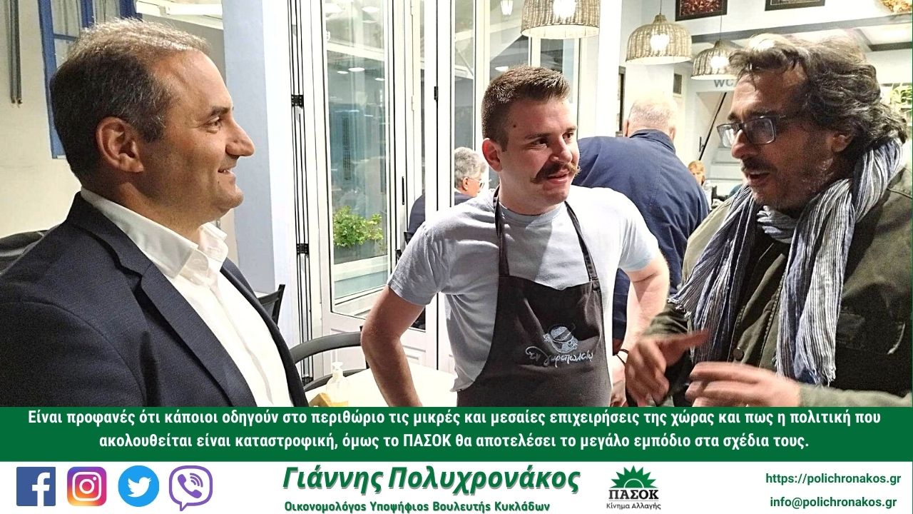 Στις προγραμματικές προτάσεις του ΠΑΣΟΚ για την ενίσχυση των μικρών επιχειρήσεων, αναφέρθηκε ο υπ. Βουλευτής Κυκλάδων και αν. Τομεάρχης Νησιωτικής Πολιτικής του ΠΑΣΟΚ κ. Γιάννης Πολυχρονάκος.