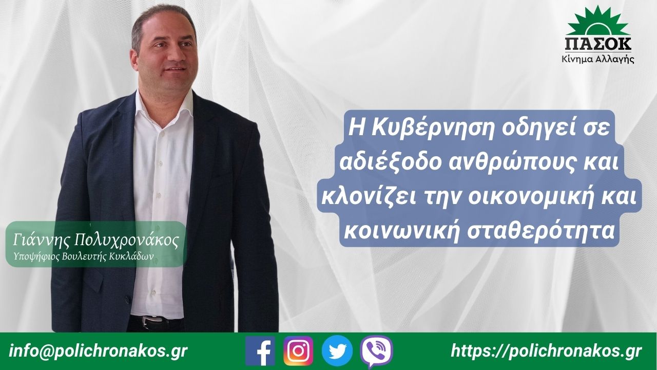 Ο αν. Τομεάρχης Νησιωτικής Πολιτικής του ΠΑΣΟΚ κ. Γιάννης Πολυχρονάκος, έκανε την ακόλουθη δήλωση: